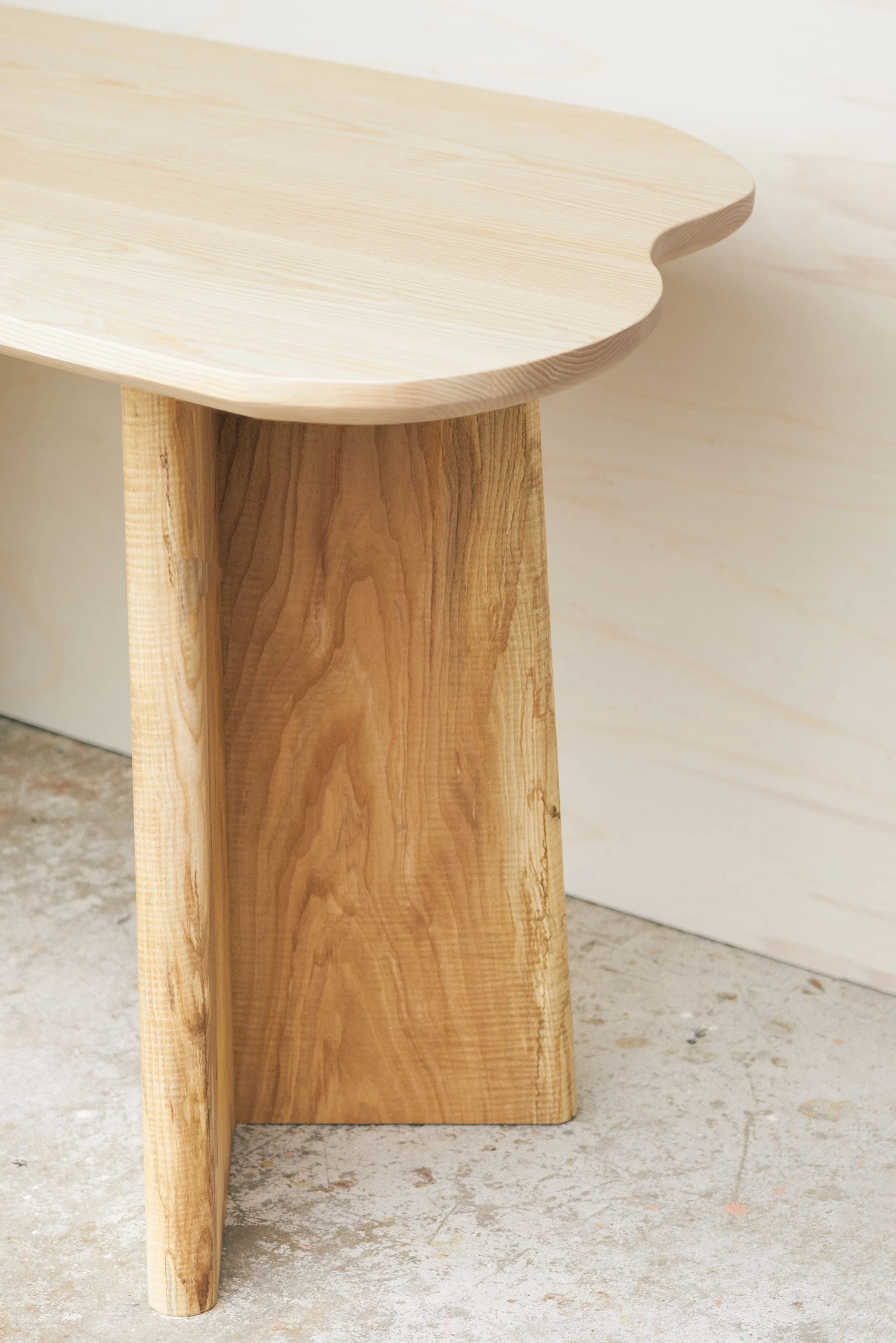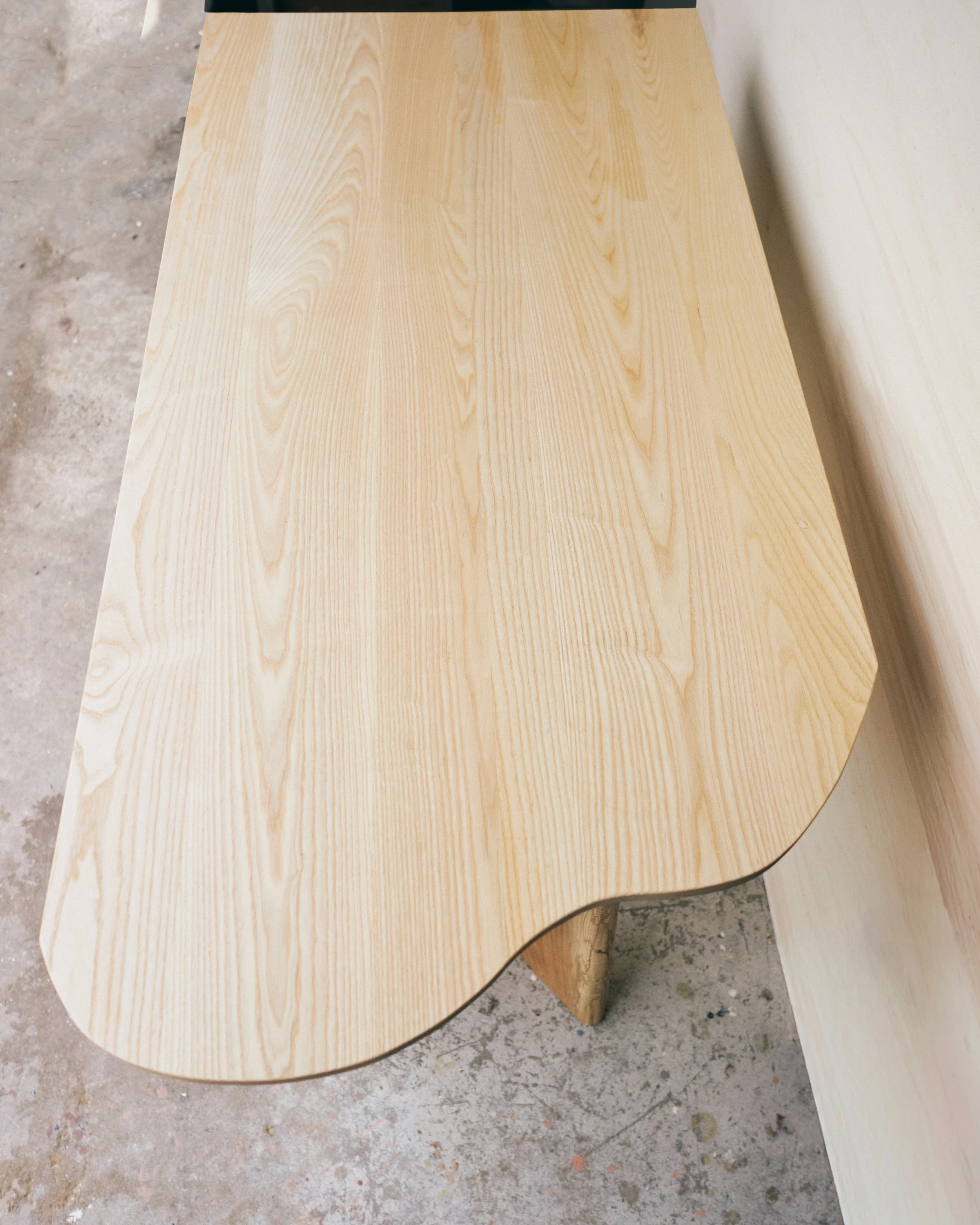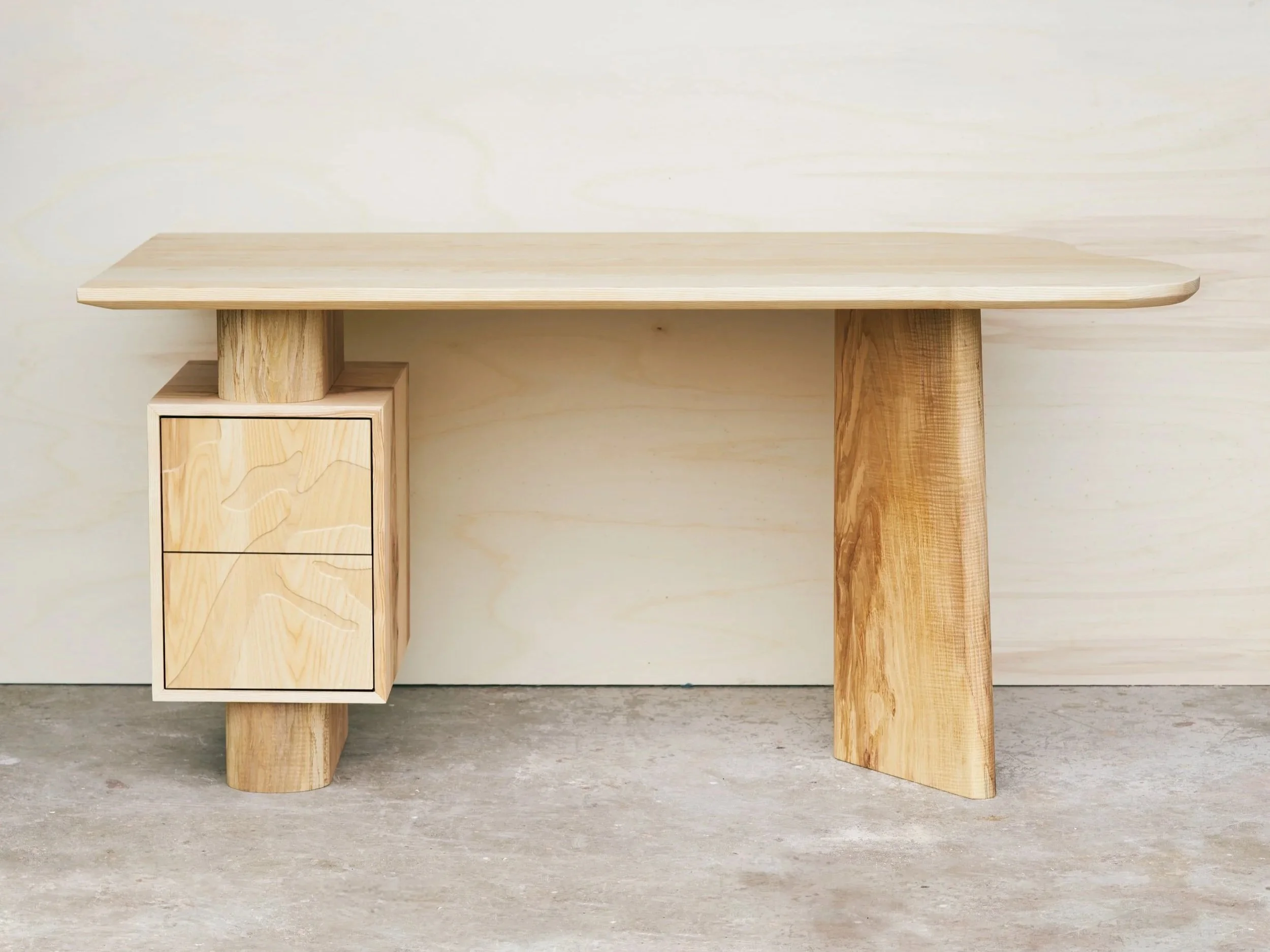 This writing desk was made from leftover material. The top and the drawer fronts where from a big table which was cut down and reshaped. We reused the pattern which was routed in the table to complement the drawer fronts! The legs were made from offcut pieces which where leftover from another production. Of Course there are signs of its original use but to me that is one of its charme’s!!!